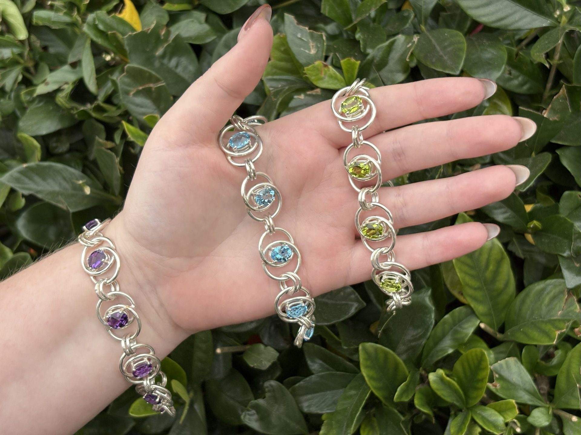 This bestselling 14 gauge handcrafted Sterling Silver gemstone bracelet is appoximately 7 1/2″, not including the fancy lobster clasp. Conjoined circles are soldered together and have an 8x6mm Blue stone set in a 4 prong setting in the center. The gemstone design is connected with 2 – 5.5mm circles.