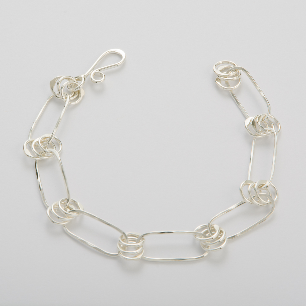 This Sterling Silver handcrafted bracelet measures approximately 7″, not including the clasp. It has 3 – 18 gauge 5mm circles and an 18 gauge 13mm pull out. Choose from the different metal options available.