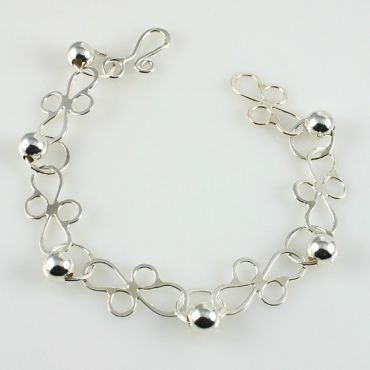 This handmade Sterling Silver 18 gauge bracelet measures approximately 7″ long, not including the clasp. It has a jumbo Lacy 8 design connected by a 9mm circle with a 7mm bead on the circles. Choose from the different metal options available.